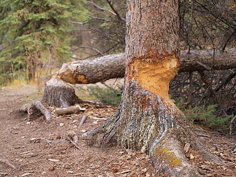 Biber muss es hier Unmengen geben – gemessen an den angenagten und umgestürzten Bäumen und den angespitzen Baumstümpfen.
