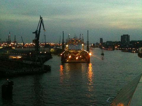Langsam geht es am Hamburger Hafen-Panorama entlang. Überall an Land staunende und winkende Leute.